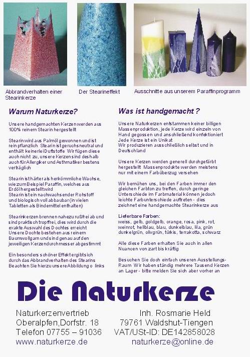 Wir liefern Ihnen handgemachte Kerzen aus eigener Produktion mit allem Zubehör.